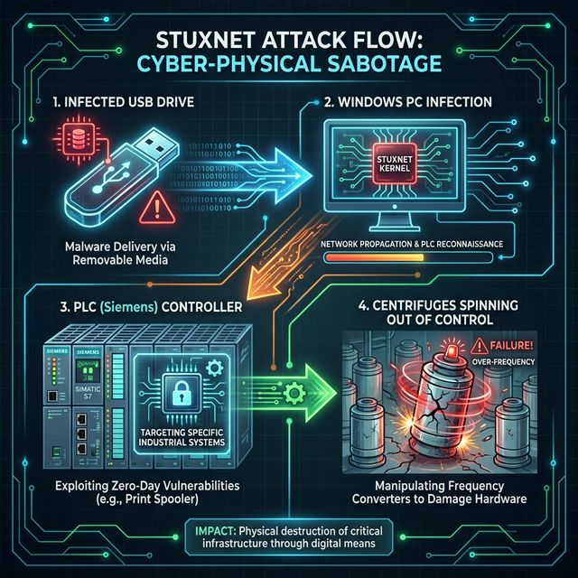 - Cover-up – The malware intercepts sensor data and replays previously recorded "normal" values, so operators don't realize anything is wrong until centrifuges start physically falling apart.
